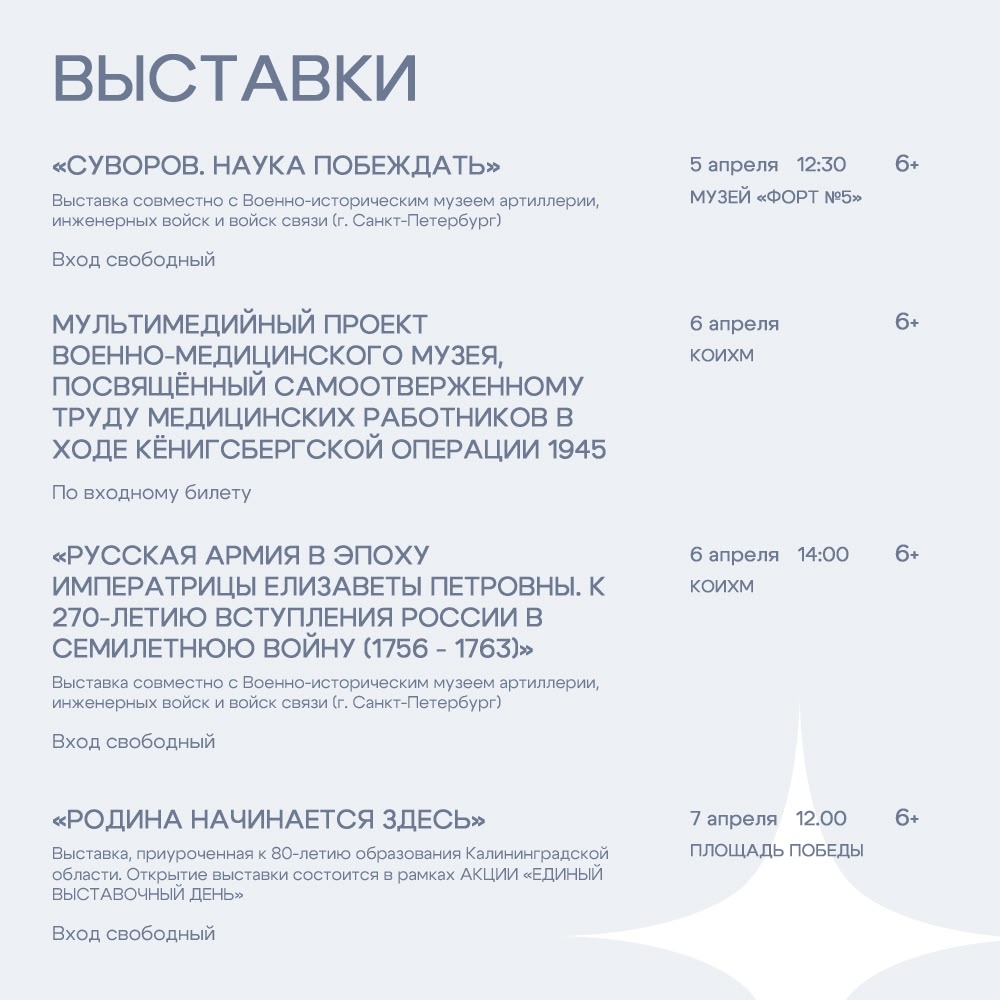 7 апреля в 12:00 — Выставка «Родина начинается здесь» (6+), приуроченная к 80-летию образования Калининградской области. Открытие выставки состоится в рамках АКЦИИ «ЕДИНЫЙ ВЫСТАВОЧНЫЙ ДЕНЬ» (Площадь Победы, вход свободный).