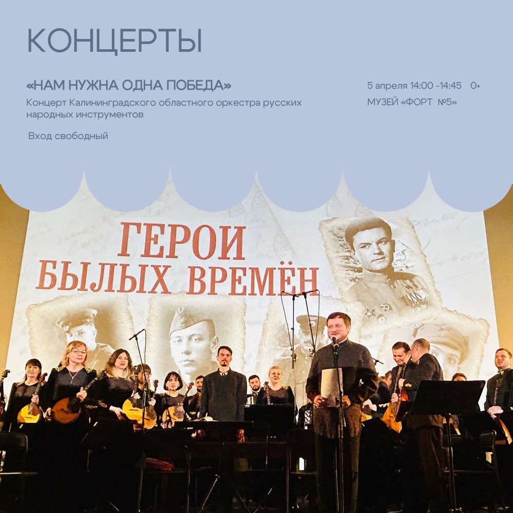 5 апреля в 14:00—14:45 — Концерт «Нам нужна одна Победа» (0+) Калининградского областного оркестра русских народных инструментов (Музей «Форт №5», вход свободный).