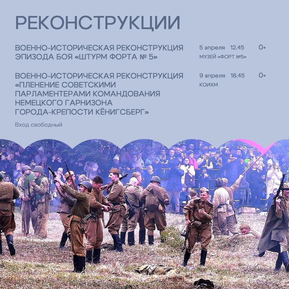 9 апреля в 18:45 — Военно-историческая реконструкция«Пленение советскими парламентерами командования немецкого гарнизона города-крепости Кёнигсберг» (Музей «Бункер», вход свободный).