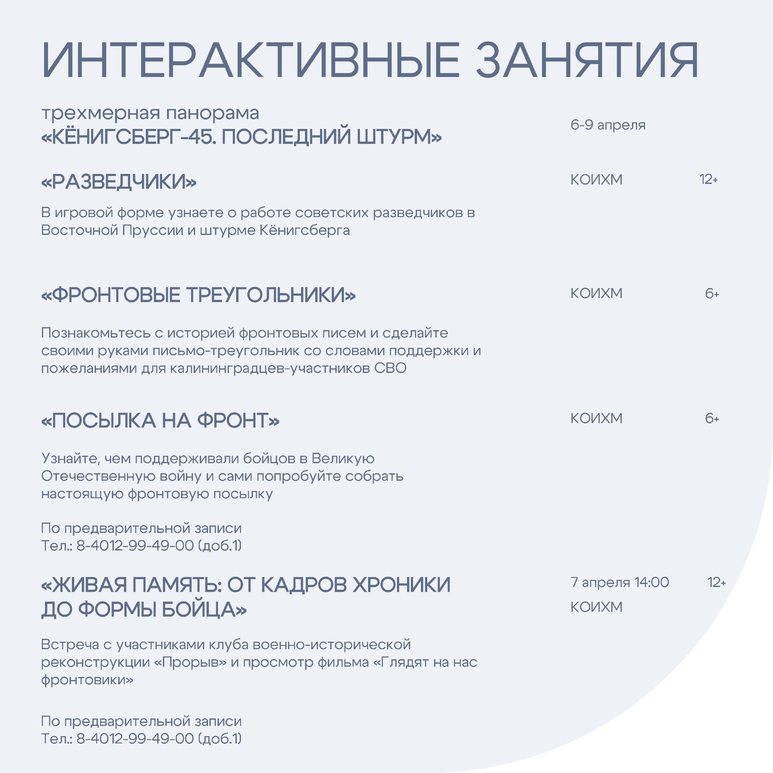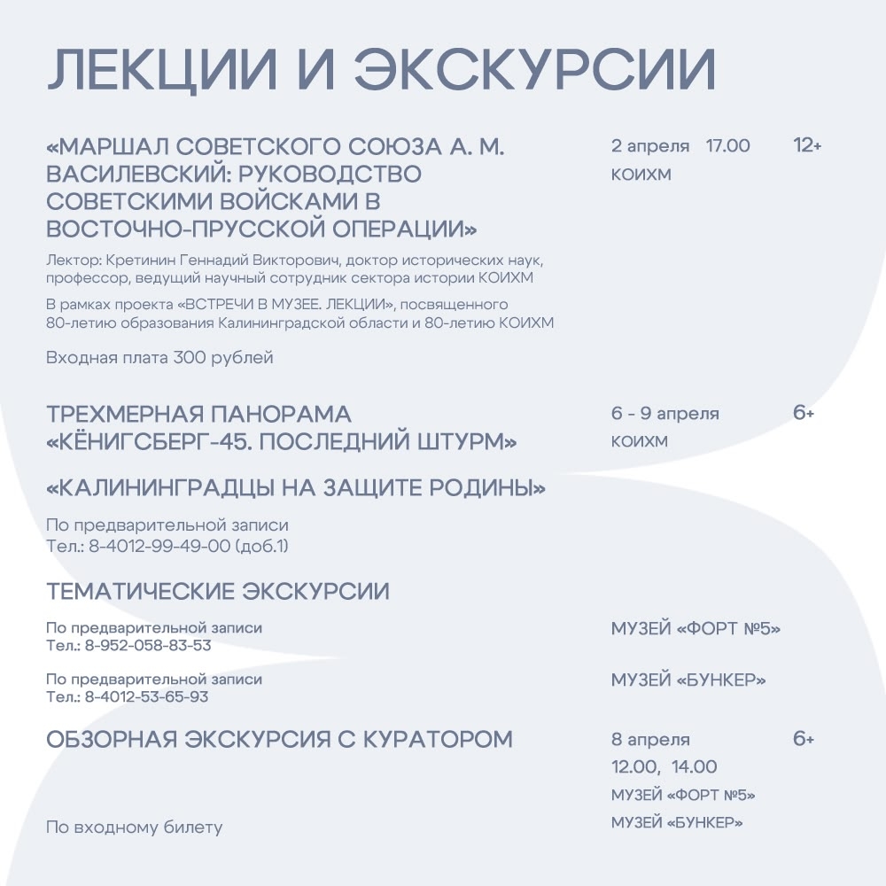 6 апреля 15:00 — Круглый стол на тему 81-й годовщины восточно-прусской операции, штурма города-крепости кёнигсберг и 80-й годовщины образования калининградской области (16+).