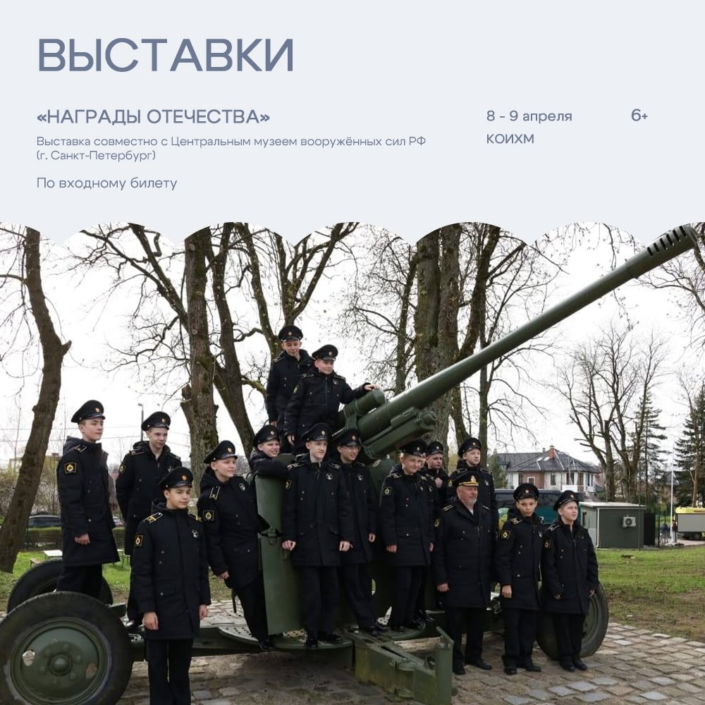 8—9 апреля — Выставка «Награды Отечества» (6+) совместно с Центральным музеем вооружённых сил РФ (КОИХМ, по входному билету).