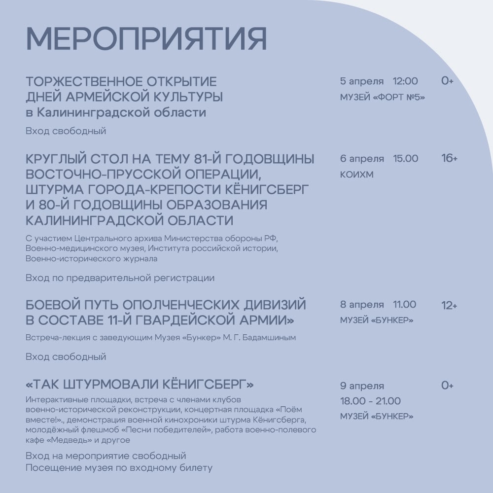 Программа мероприятий к 81-й годовщине Великой Победы, к 81-й годовщине штурма города-крепости Кёнигсберг и к 80-летию образования Калининградской области в Калининградском областном историко-художественном музее, музеях «Форт №5» и «Бункер».