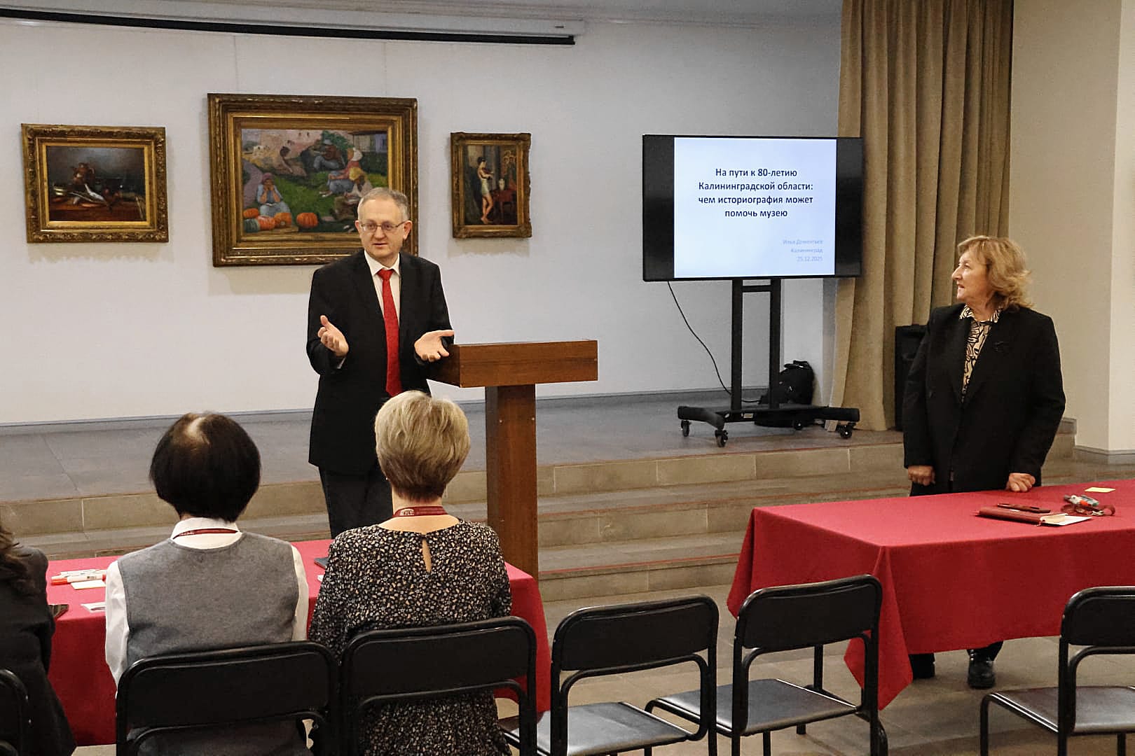 С лекцией «На пути к 80-летию Калининградской области: чем историография может помочь музею» выступил кандидат исторических наук, доцент Института образования и гуманитарных наук Илья Дементьев.