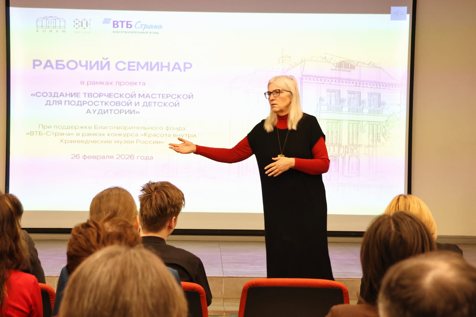«Этот проект для нас особенно ответственен — к подростковой аудитории важно найти нужный подход к изучению истории, так чтобы им было интересно. Через вовлечение детей мы рассчитываем, что наша творческая лаборатория будет жить, станет мобильной, модной, содержательной, и ребята сами к нам тоже потянутся», — поприветствовала участников семинара директор КОИХМ Екатерина Манюк.